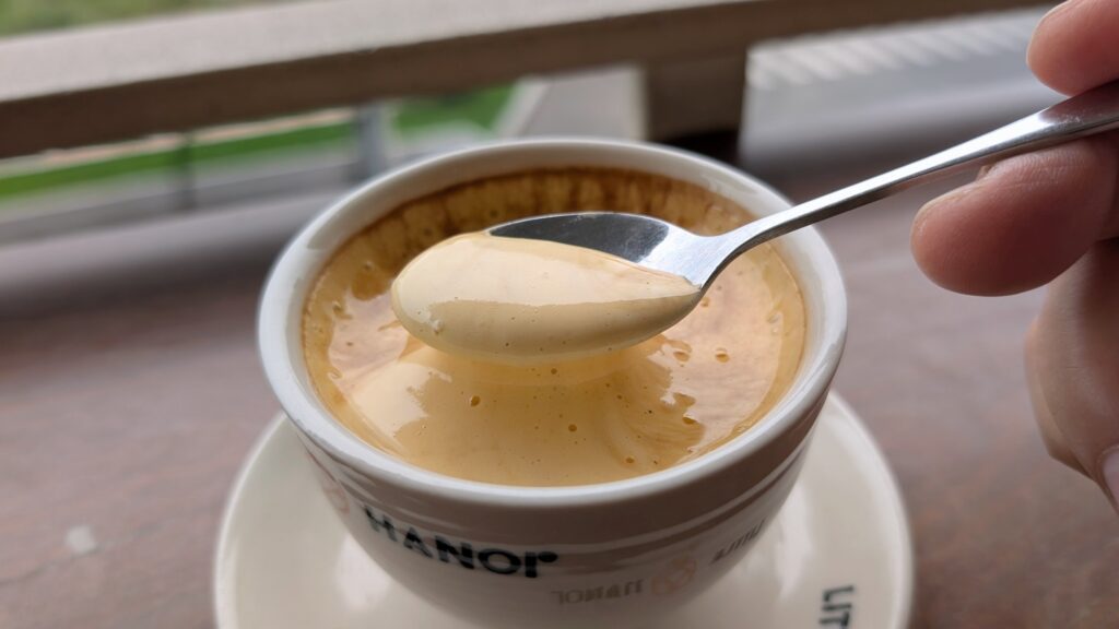 ここのエッグコーヒーは、他の有名店にも引けを取らない格別なレベルです。きめ細かく泡立てられたエッグクリームが、深煎りのコーヒーの苦味を包み込み、強いコクを生み出しています。一口飲むと、濃厚でふんわりとしたエッグクリームが舌の上でとろけます。甘さのバランスが絶妙で、カスタードクリームのようなリッチな口当たりが、深煎りのベトナムコーヒーの苦味と完璧に調和します。