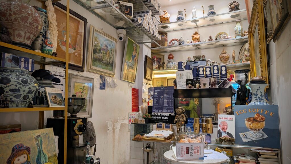 扉を開けて中に入ると、店内はわずか6名ほどしか座れないほどの空間。しかし、その限られたスペースには、古き良きベトナムの美意識が凝縮されています。店内の壁や棚には、ベトナム特有の骨董品やレトロな調度品がセンス良く飾られています。