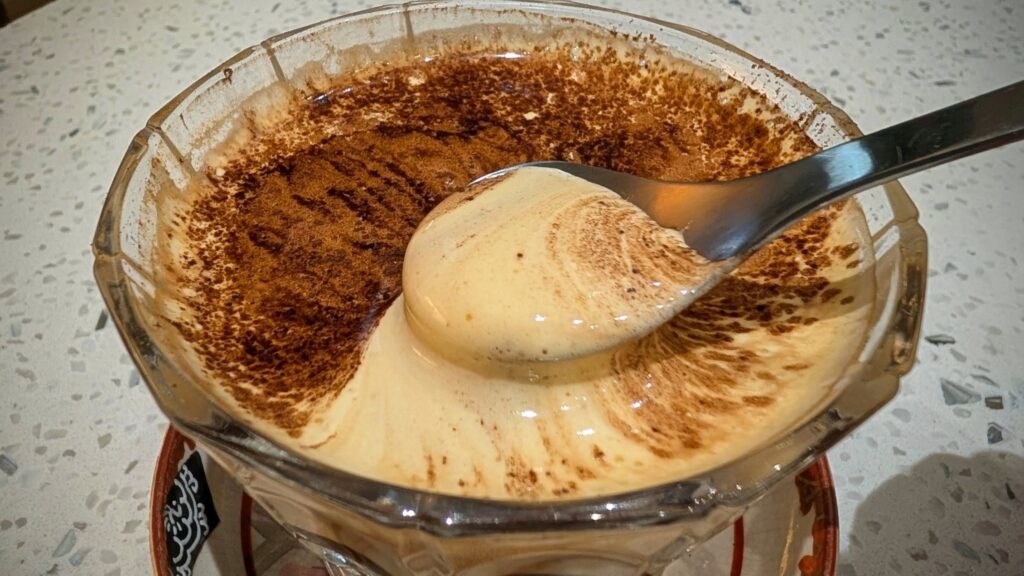 濃厚な上層部分はエッグクリームです。このクリーミーなフォームは、主に卵黄とコンデンスミルク、そして少量の砂糖を混ぜて、空気を含ませながら丁寧に泡立てて作られます。まるでカスタードクリームや濃厚なティラミスのマスカルポーネチーズのような、甘くリッチでふんわりとした口当たりが特徴です。卵の生臭さは全くなく、リッチな甘さと香りだけが残ります。