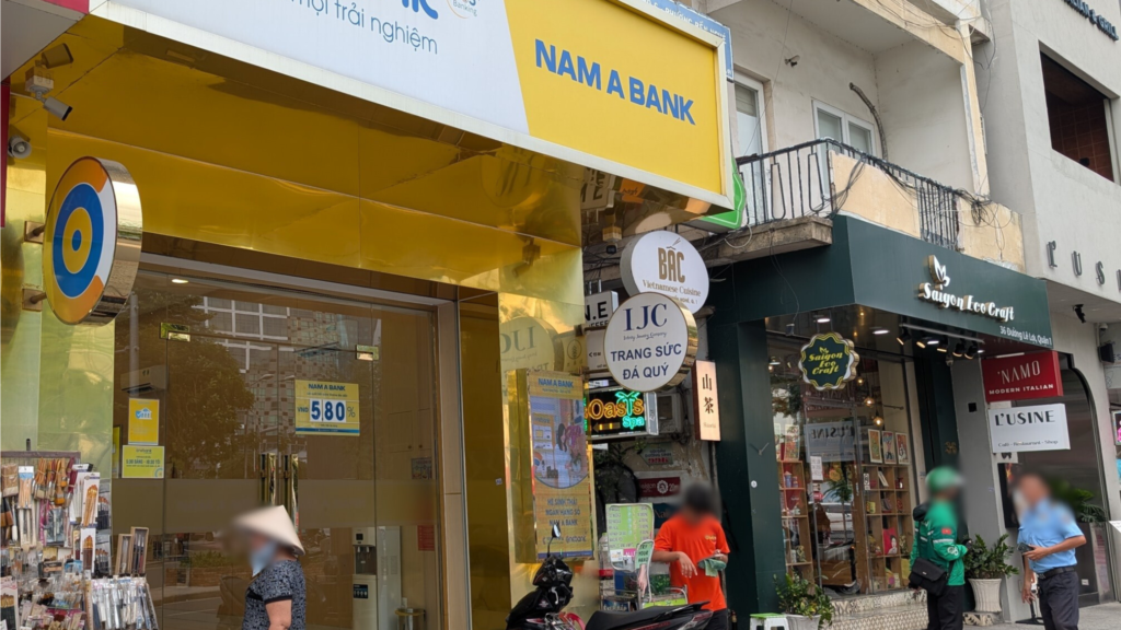 この地図の店舗は、ビンコムセンターというショッピングモールの地下3階にあります。エスカレーターで降りていくとHighlands Coffee (ハイランズコーヒー) が見えてきます。その隣にあります。