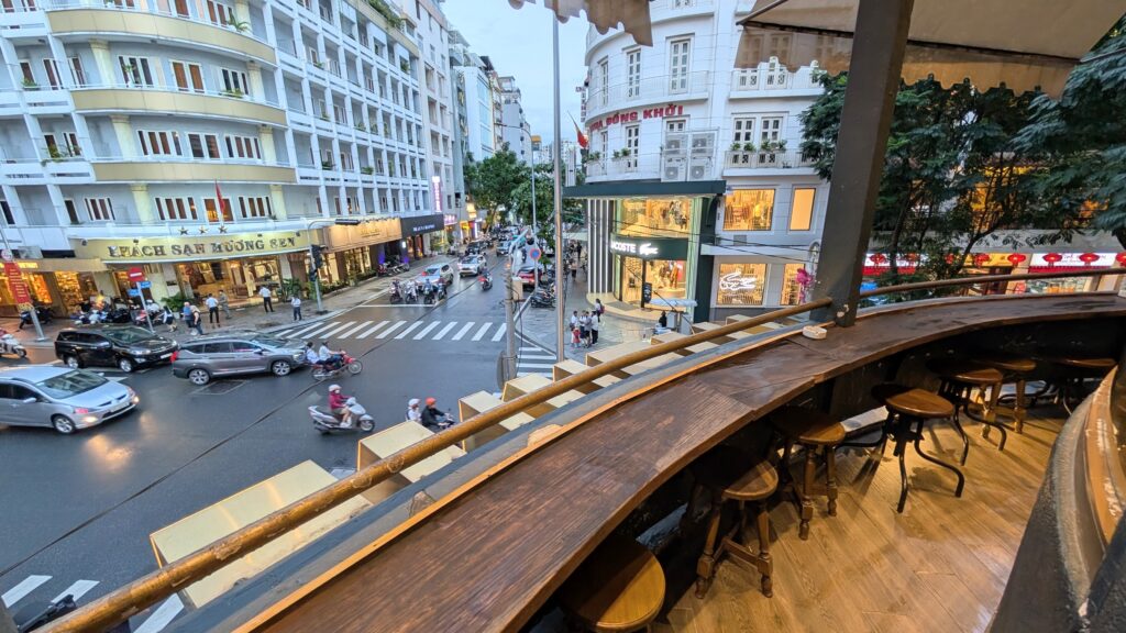 メイン通りの交差点にあり、とても目立つ場所にあります。空調の効いた二階の窓側席もいいのですが、三階の外のバルコニー席がおすすめです。交差点を行き交う人々を眺めながらまったりできますよ。私はホーチミンの桟敷席(さじきせき)と呼んでます。