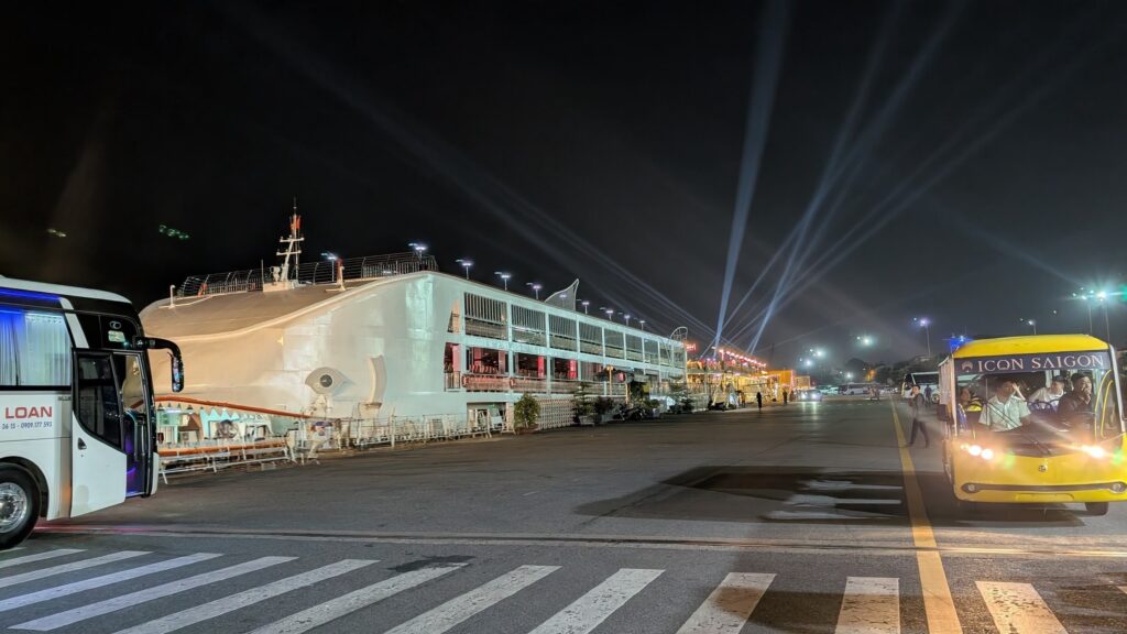 下段の写真2枚が停泊している各社のクルーズ船です。ICON SAIGONに乗る場合は、黄色の電動カートに乗せてもらい移動しました。
