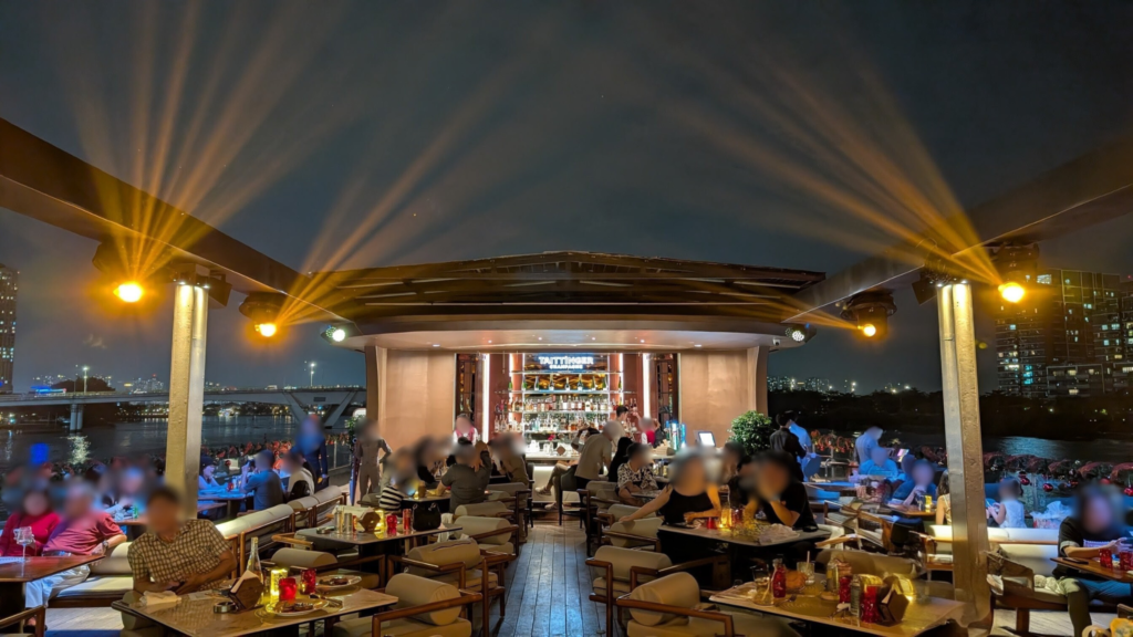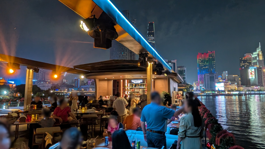 クルーズ船の最上階で夜景を楽しむ「ICON SAIGON」の最大の魅力は、その開放的な空間の設計にあります。乾季のホーチミンの夜は涼しく、川を渡る風が本当に心地よいものです。私たちが案内されたのは、屋根のない最上階のオープンテラス席です。