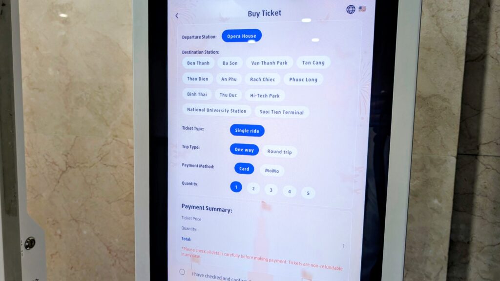 1,まず券売機の右上のベトナム国旗をタップして、言語を英語に変えましょう。
