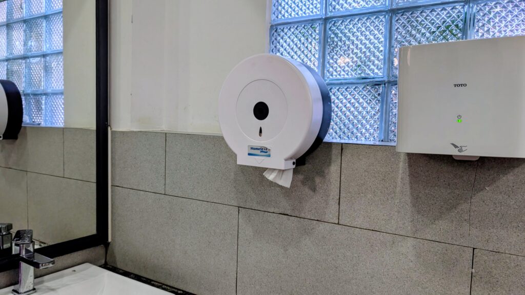 入り口に大型のトイレットペーパーが設置してあり、各自が必要分を取ってから個室に入るスタイルのトイレもあります。
